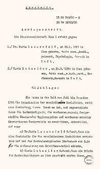 Bild 02: Anklageschrift gegen Marie Jahoda. Wien, am 28. Mai 1937, S. 1 / Quelle: Archiv für die Geschichte der Soziologie in Österreich, Nachlass Marie Jahoda, Signatur 41/7.1.1, pag. 126. / ©