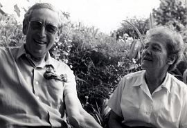 <Bild 03: Marie Jahoda und Austen Albu im Garten ihres Hauses. Keymer 1959 / Quelle: AGSOe, Nachlass Marie Jahoda, Signatur 41/8.67. / © Copyright
