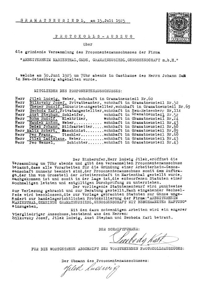 die Beantragung zur Gründung der Genossenschaft »Arbeiterheim Marienthal«, welche 1926