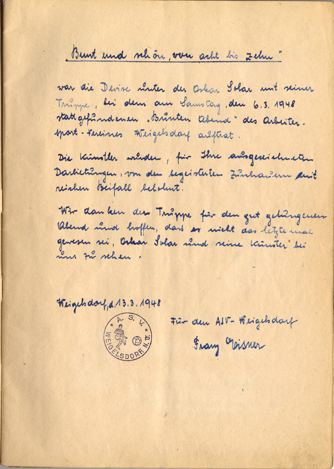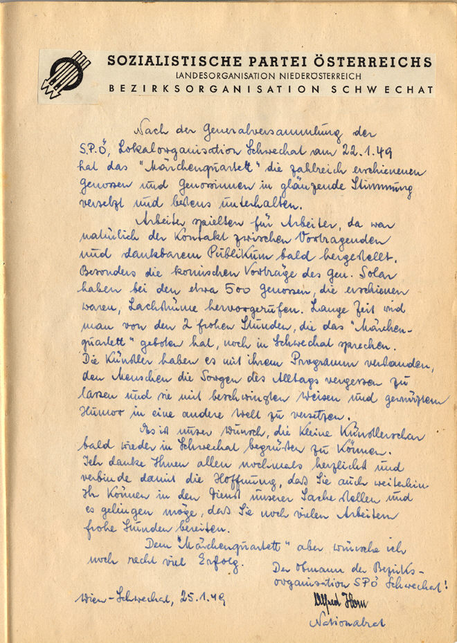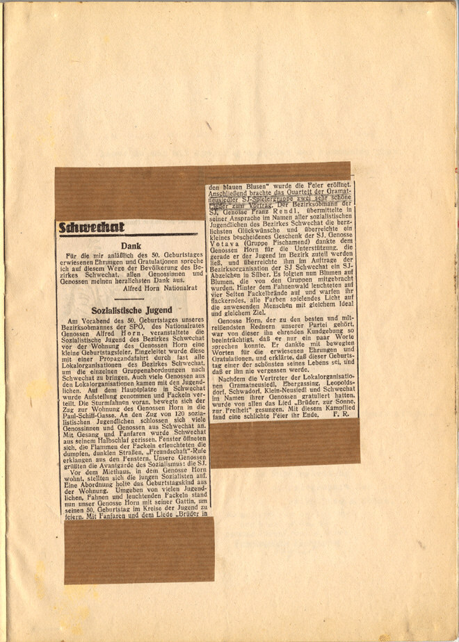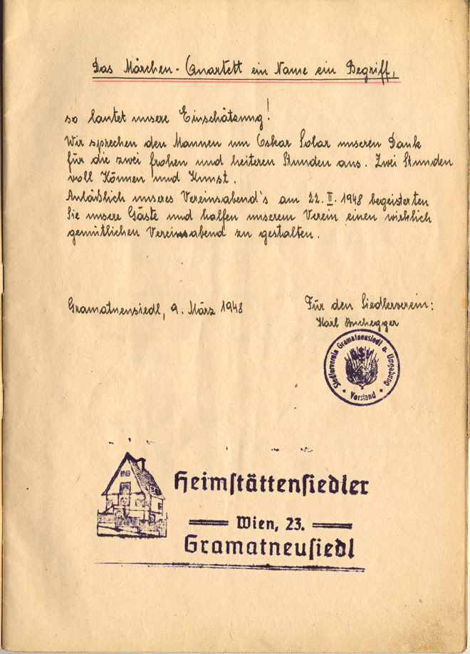 »Heimstättensiedler / Wien, 23. / Gramatneusiedl«, S. [7] »A.S.V. Weigelsdorf, N.Ö.«, S. [9] »Sozialistische Partei Österreichs /