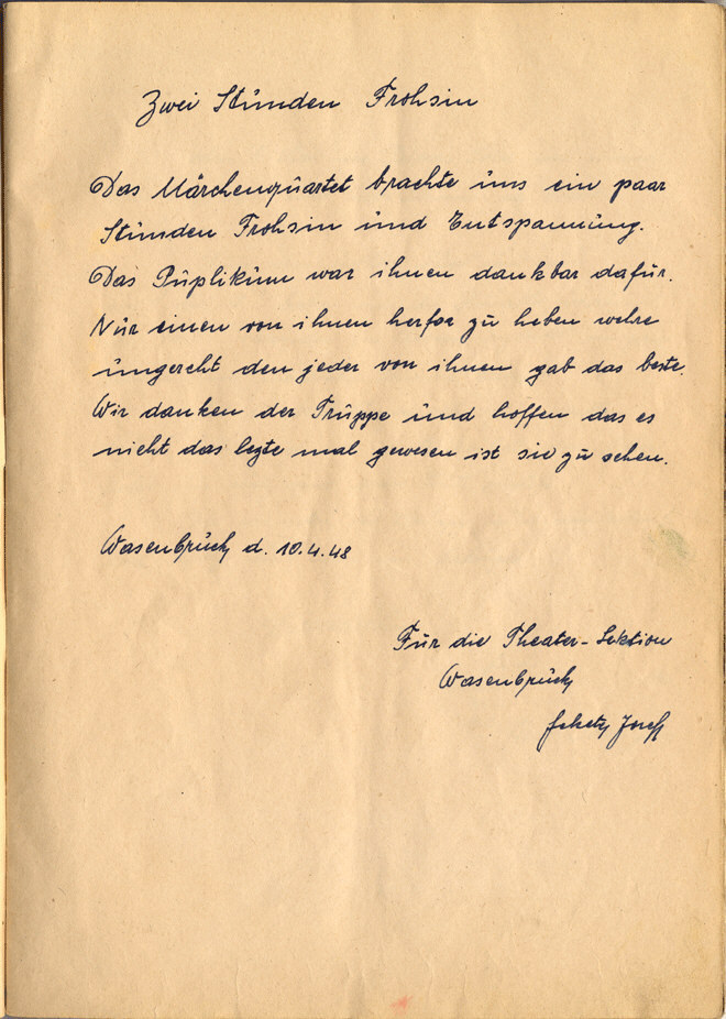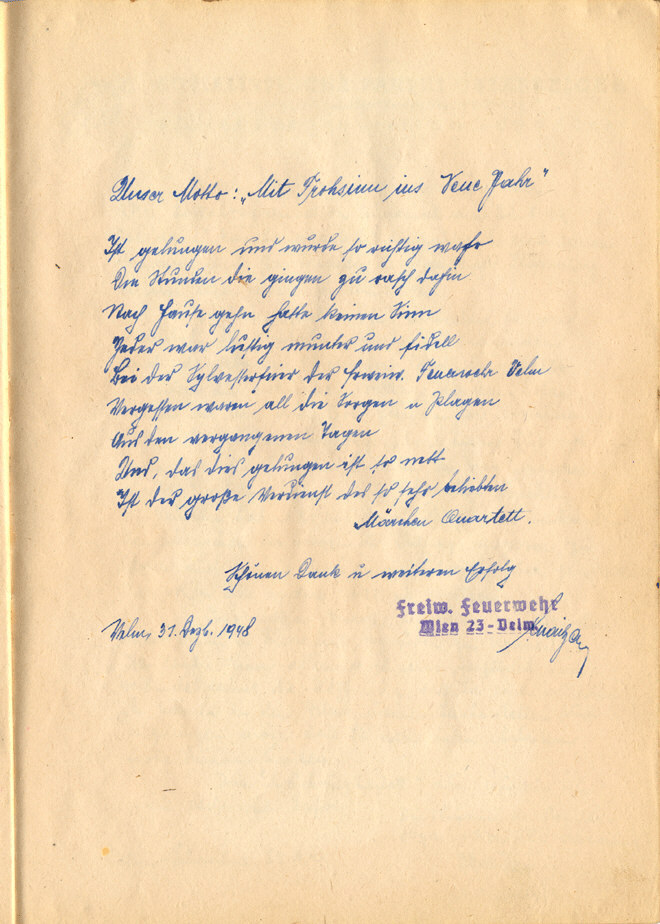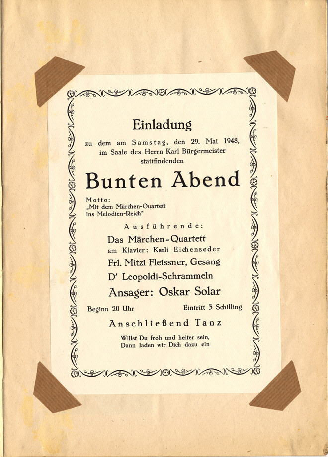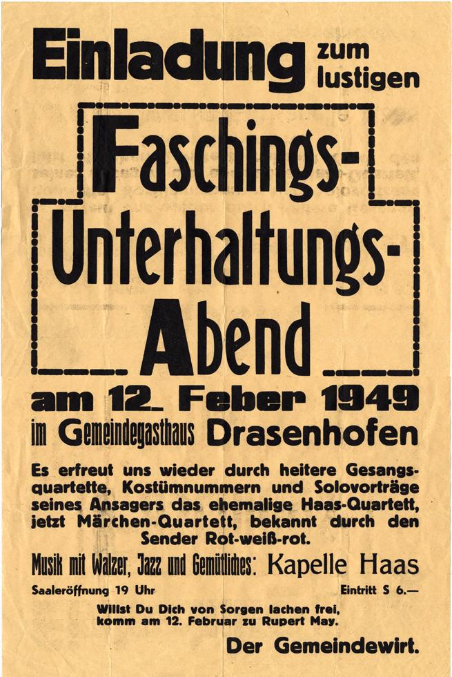 Faschings-Unterhaltungs-Abend in Drasenhofen (Niederösterreich) am 12. Februar 1949, 1 Blatt. Das Buch enthält auch mehrere Stempel: S. [5]