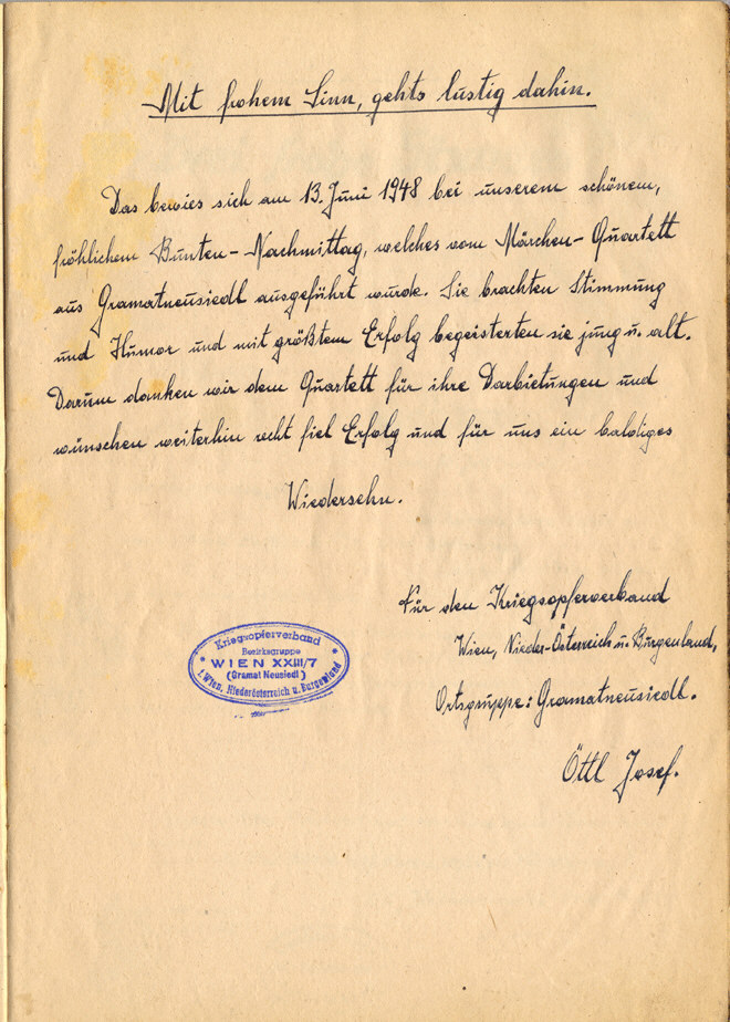 u[nd] Burgenland / Bezirksgruppe / Wien XXIII/7 / (Gramat Neusiedl)«, S. [19] »Touristenverein /