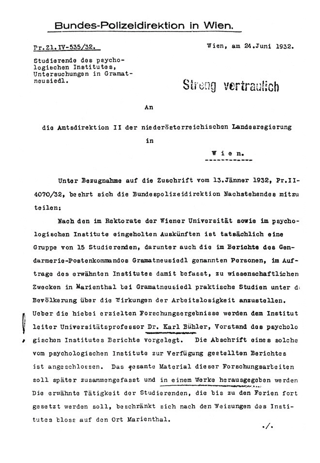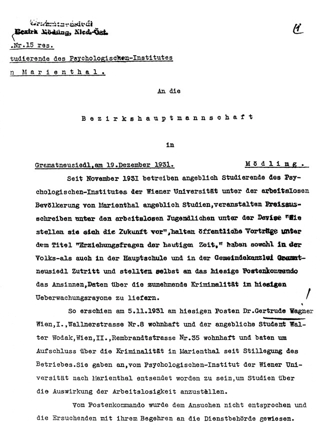 Berichten der Exekutive über das Projektteam der Marienthal-Studie]