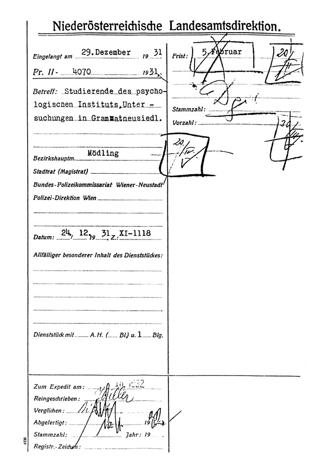 Bezirkshauptmannschaft Mödling. Gramatneusiedl, am 19. Dezember 1931; 3 Bl., pag. 1–3; Maschinenschrift.