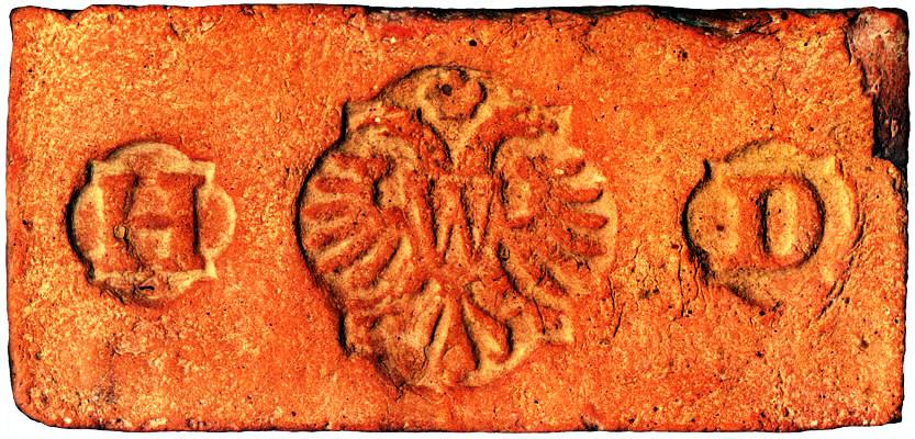 Ziegel von der 1858 wieder aufgebauten Kiebitzmühle, Kiebitzmühle 1. Der Ziegel wurde von der Wienerberger Ziegelfabrik auf dem Wienerberg (heute zu Wien 10.) hergestellt. Die den Doppeladler flankierenden Initialen »H« und »D« stehen für Heinrich Drasche (seit 1870: Ritter von Wartinberg; 1811–1880).