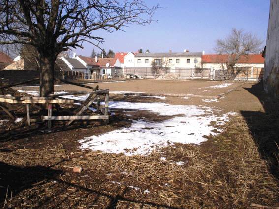 Hofanlage beim ehemaligen Arbeiterwohnhaus Bäckerhaus, Oberortsstraße 23, vom Süden Richtung der im Norden gelegenen Oberortsstraße gesehen.