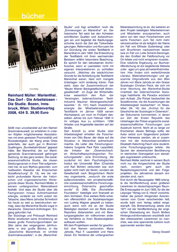 Reinhard Müller: Marienthal. Das Dorf – Die Arbeitslosen – Die Studie. Bozen, Innsbruck, Wien: Studienverlag 2008, 424 S.