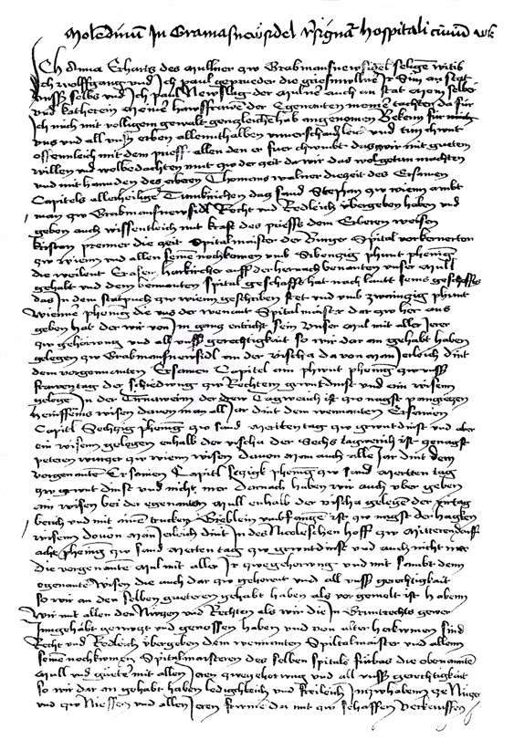 Versezen schaffen machen vnd geben Wem sy wellenn Als mit anderen gueteren die zw dem egenanten Spital gehorent an vnsser erberen vnd menigeleichs Von vnseren wegen Irrwng vnd Hindernws vngeuerleich wir sein auch mit sambt allen vnseren