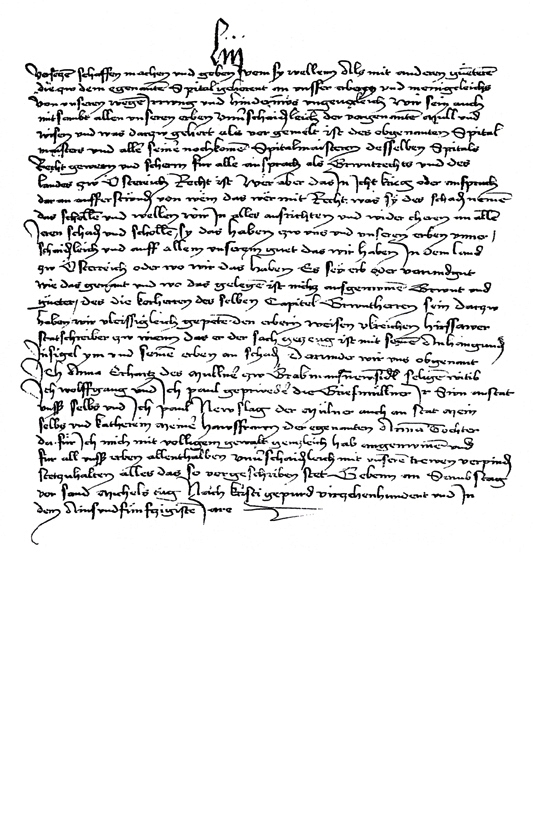 Mull vnd wisen vnd was darzw gehert als vor gemelt ist des obgenanten Spital maisters vnd alle seine nochkomen Spitalmaisteren desselben Spitals Recht gewern vnd scherm fur alle ansprach als Grwntrechts vnd des Landes zw Ostereich Recht ist Wer aber das In Icht