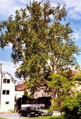 Die Platane als letzter noch erhaltener Baum des ehemaligen Parks Herrengarten; sie steht nicht, wie bisweilen behauptet, unter Naturschutz. Siehe auch das Bild aus dem Jahr 1942. Links das neu erbaute Wohnhaus Fischerweg 2 (Stiege 2), dahinter das Arbeiterwohnhaus Altgebäude, Hauptstraße 64.