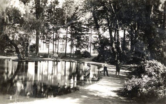 Der Teich im Park Herrengarten. Im Hintergrund die Rückseite vom Arbeiterwohnhaus Altgebäude, Hauptstraße 64.