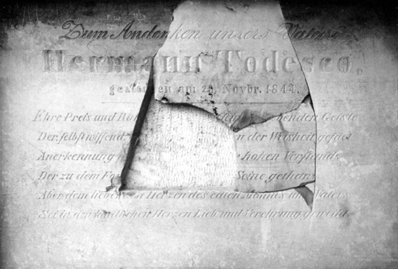 Die nicht mehr erhaltene, durch eine neue ersetzte Gedenktafel an der Stirnseite des Sockels des Hermann Todesco-Denkmals: