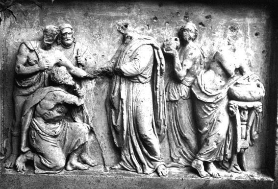 Relief rückwärts am Sockel des Hermann Todesco-Denkmals (vor der Restaurierung 1989 bis 1991): Patronage und Industrie.