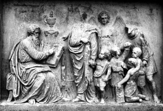 Relief links am Sockel des Hermann Todesco-Denkmals (vor der Restaurierung 1989 bis 1991): Wissenschaft und Unterricht.