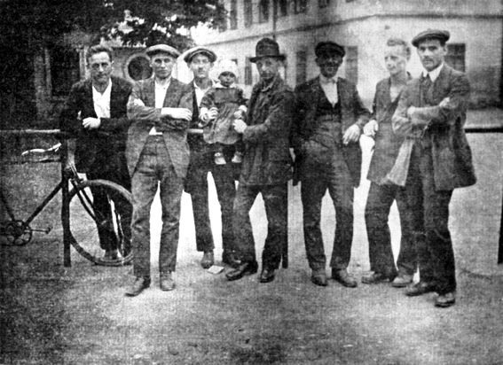 Arbeiter der Textilfabrik Marienthal am Platz an der Hauptstraße vor dem Consum im Hof des Arbeiterwohnhauses Altgebäude, Hauptstraße 64.