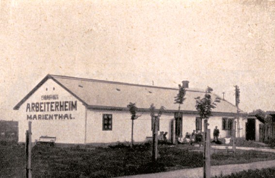Das Arbeiterheim Marienthal, bei Marie-Jahoda-Platz 1, von Südwesten gesehen.