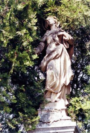 Die Statue der Mater Amabilis auf der Steinsäule nahe der Fischabrücke (Reisenberg) von Westen gesehen.