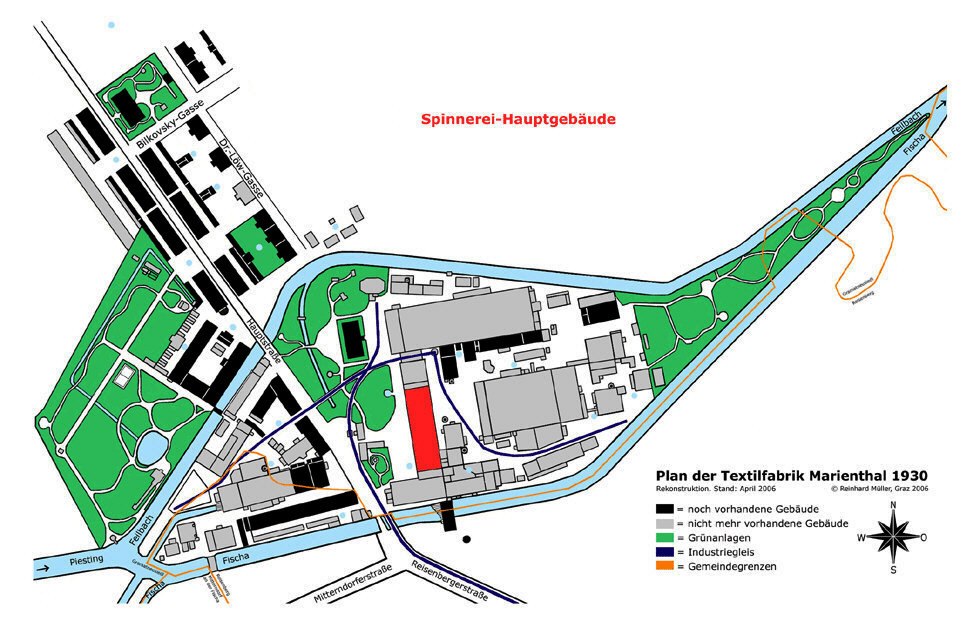 Der Spinnereikomplex lag in Gramatneusiedl östlich der Hauptstraße, teils parallel zu dieser, teils parallel zur