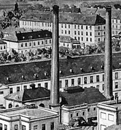 Links (teilweise verdeckt) das Spinnerei-Dampfmaschinenhaus, davor der Spinnerei-Dampfschornstein I, rechts anschließend vorne die Wasserreinigung, dahinter und rechts davon (und teilweise verdeckt) das Spinnerei-Kesselhaus, ganz rechts der frei stehende Spinnerei-Dampfschornstein II.