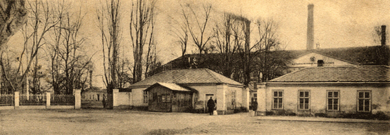 Die Einfahrtanlage der Textilfabrik Marienthal: links das Portierhaus mit dem an der Straßenseite angebauten Brückenwaagehäuschen, rechts das Technische Büro.