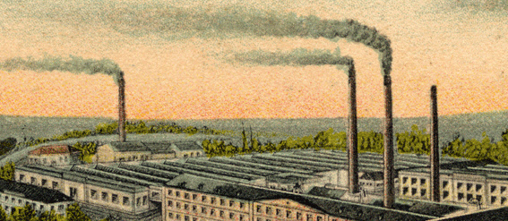 Links vorne die Weberei-Kanzlei, Warenlegerei und Einzieherei, rechts an die Spinnerei angebaut die Durchfahrt, dahinter und rechts davon die Scheds des Weberei-Hauptgebäudes.