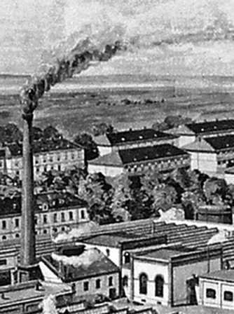 Links der Weberei-Schornstein, rechts angebaut das Weberei-Kesselhaus, daran rechts angebaut das Weberei-Dampfmaschinenhaus und Dynamogebäude, wiederum rechts daran angebaut der etwas niedrigere Generatorenraum, dann rechts das Weberei-Maschinenhaus.