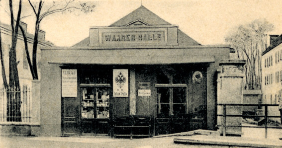 Die »Waaren-Halle« an der Straßenseite des Arbeiterwohnhauses Schulhof, Hauptstraße 66. Links das Arbeiterwohnhaus Spitalhof, Hauptstraße 68. Rechts das Arbeiterwohnhaus Altgebäude, Hauptstraße 64.
