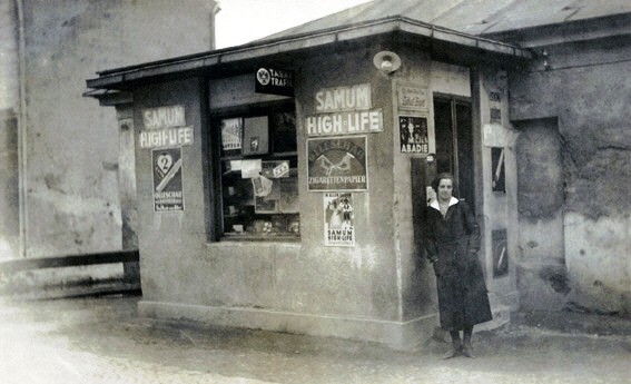 Die Tabaktrafik nahe der Fischabrücke beim Arbeiterwohnhaus Neugebäude, An der Fischa 1, angebaut an die ehemalige Rollkammer. Rechts im Hintergrund die Rückseite des Kaufhauses mit Fleischerei, Selcherei und Alkoholausschank von Heinrich Treer (1882–1961), Mitterndorferstraße 2.