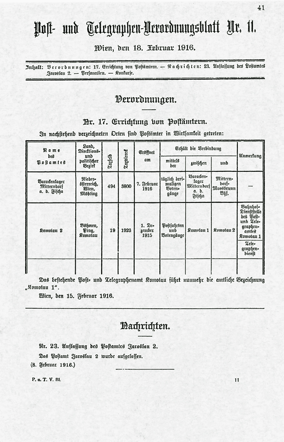 Post- und Telegraphen-Verordnungsblatt Nr. 11. Wien, den 18. Februar 1916.