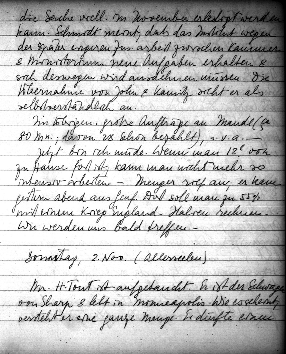 Mr. H. Tout ist aufgetaucht. Er ist der Schwager von Sharp und lebt in Minneapolis. Wie es scheint, versteht er eine ganze Menge. Er dürfte einen Monat hier bleiben. Auch eine junge, sehr nette Engländerin, Miss Upcott, tauchte auf. Tout sieht die Übersetzung durch. Das Ganze geht ganz gut vorwärts, ich schätze, daß das Buch Ende Jan. fertig sein kann. Den Anhang will ich gründlich erweitern, damit die Leute, die meine Arbeiten nicht kennen, den Unterbau der Sache verstehen lernen. Hoffentlich wird es kein allzu grosser Mißerfolg.