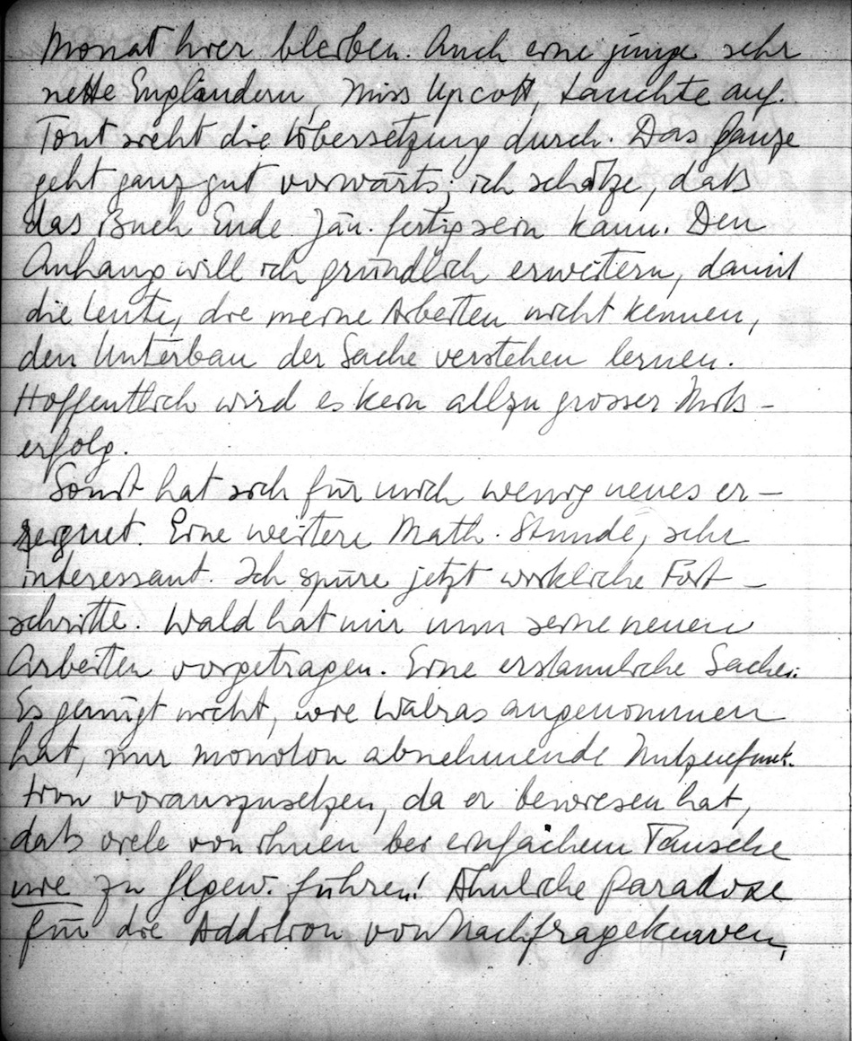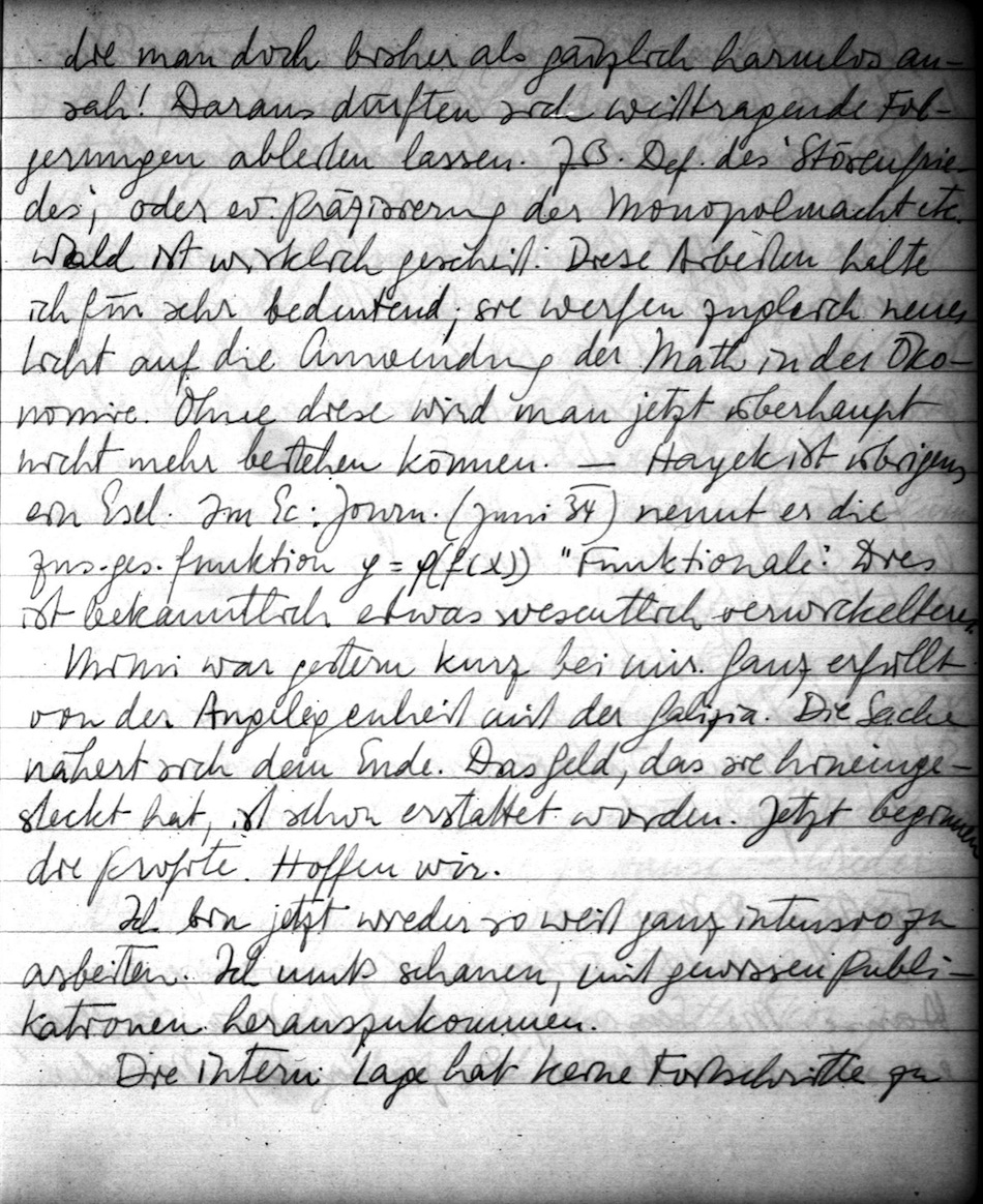 Sonst hat sich für mich wenig neues ereignet. Eine weitere Math. Stunde; sehr interessant. Ich spüre jetzt wirklich Fortschritte. Wald hat mir nun seine neuen Arbeiten vorgetragen. Eine erstaunliche Sache: Es genügt nicht, wie Walras angenommen hat, nur monoton abnehmendeNutzenfunktion vorauszusetzen,da er bewiesen hat, daß vielen von ihnen bei einfachem Tausche nie zu Glgew. führen! Ähnliche Paradoxe für die Addition von Nachfragekurven, die man doch bisher als gänzlich harmlos ansah! Daraus dürften sich weittragende Folgerungen ableiten lassen: Z. B. Def. des `Störenfriedes, oder ev. Präzisierung der Monopolmacht etc. Wald ist wirklich gescheit. Diese Arbeiten halte ich für sehr bedeutend; sie werfen zugleich neues Licht auf die Anwendung der Math. in der Ökonomie. Ohne diese wird man jetzt überhaupt nicht mehr bestehen können. Hayek ist übrigens ein Esel. Im Ec. Journ. (Juni 34) nennt er die Zus.ges.funktion g = (f(x)) Funktionale. Dies ist bekanntlich etwas wesentlich verwickeltees