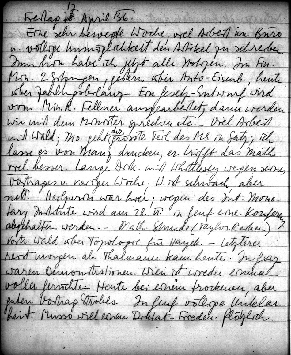 Eine sehr bewegte Woche; viel Arbeit im Büro u. völlige Unmöglichkeit den Artikel zu schreiben. Immerhin habe ich jetzt alle Notizen. Im Fin.Min. 2 Sitzungen, gestern über Auto-Eisenb., heute über Zahlungsbilanz. Ein Gesetz-Entwurf wird vom Min.R. Fellner ausgearbeitet, dann werden wir mit dem Minister sprechen etc. Viel Arbeit mit Wald; Mo. geht der grösste Teil des MS in Satz; ich lasse es von Manz drucken; er trifft das Math. viel besser. Lange Disk. mit Whittlesey wegen seines Vortrages v. voriger Woche; W. ist schwach, aber nett. Heilp war hier; wegen des Int. Monetary Institute wird am 28. VI. in Genf eine Konferenz abgehalten werden. Math. Stunde (Taylor Reihen) Vortr. Wald über Topologie für Hayek. Letzterer reist morgen ab. Thalmann kam heute. In Graz waren Demonstrationen. Wien ist wieder einmal voller Gerüchte. - Heute bei einem trockenen, aber guten Vortrag Strobls. In Genf völlige Unklarheit. Musso will einen Diktat-Frieden. Plötzlich scheint aber Japan auf Abessiniens Seite zu treten, wodurch die Verwirrung noch grösser wird. Sehr intelligent ist die Menschheit; das ergibt sich bei Betrachtung aller dieser politischen Dinge.