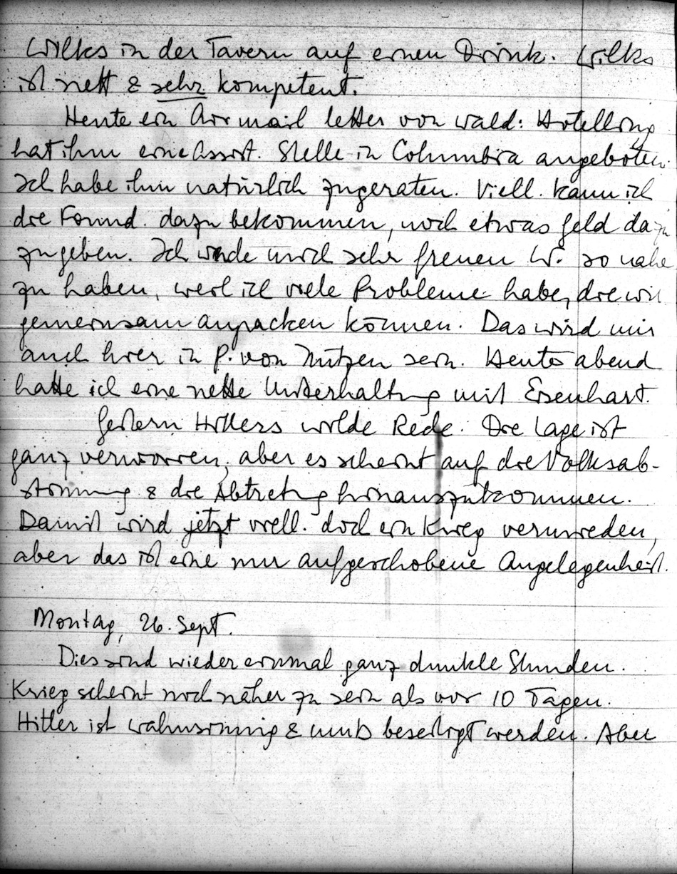 Gestern Hitlers wilde Rede: Die Lage ist ganz verworren; aber es scheint auf die Volksabstimmung & die Abtretung hinauszukommen. Damit wird jetzt viell. doch ein Krieg vermieden, aber das ist eine nur aufgeschobene Angelegenheit.