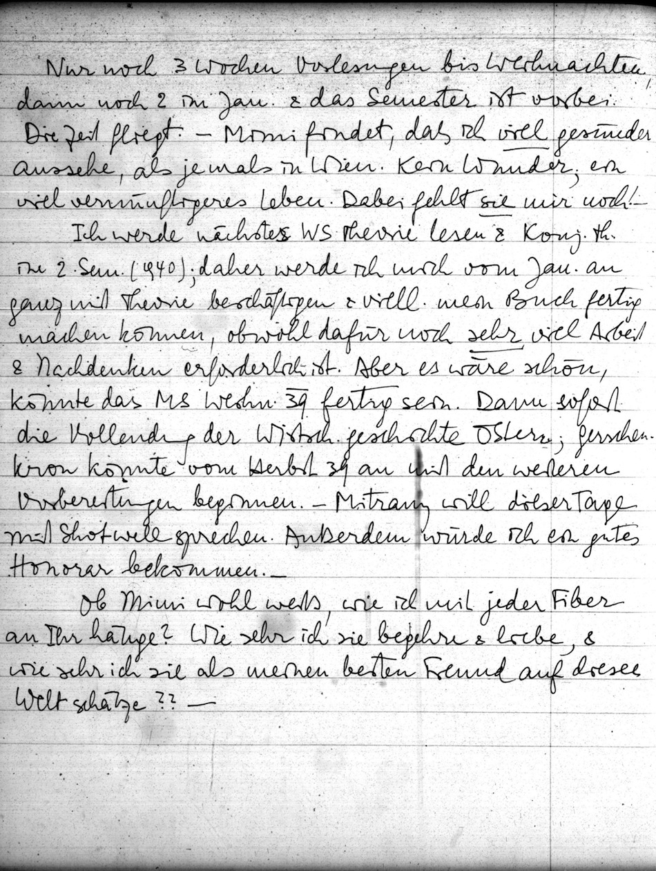 Ich werde nächstes WS Theorie lesen & Konj.th. im 2. Sem. (1940); daher werde ich mich vom Jan. an ganz mit Theorie beschäftigen & viell. mein Buch fertig machen können, obwohl dafür noch sehr viel Arbeit & Nachdenken erforderlich ist. Aber es wäre schön, könnte das MS Weihn. 39 fertig sein. Dann sofort die Vollendung der Wirtsch.geschichte Österr.; Gerschenkron könnte vom Herbst 39 an mit den weiteren Vorbereitungen beginnen. Mitrany will dieser Tage mit Shotwell sprechen. Außerdem würde ich ein gutes Honorar bekommen.
