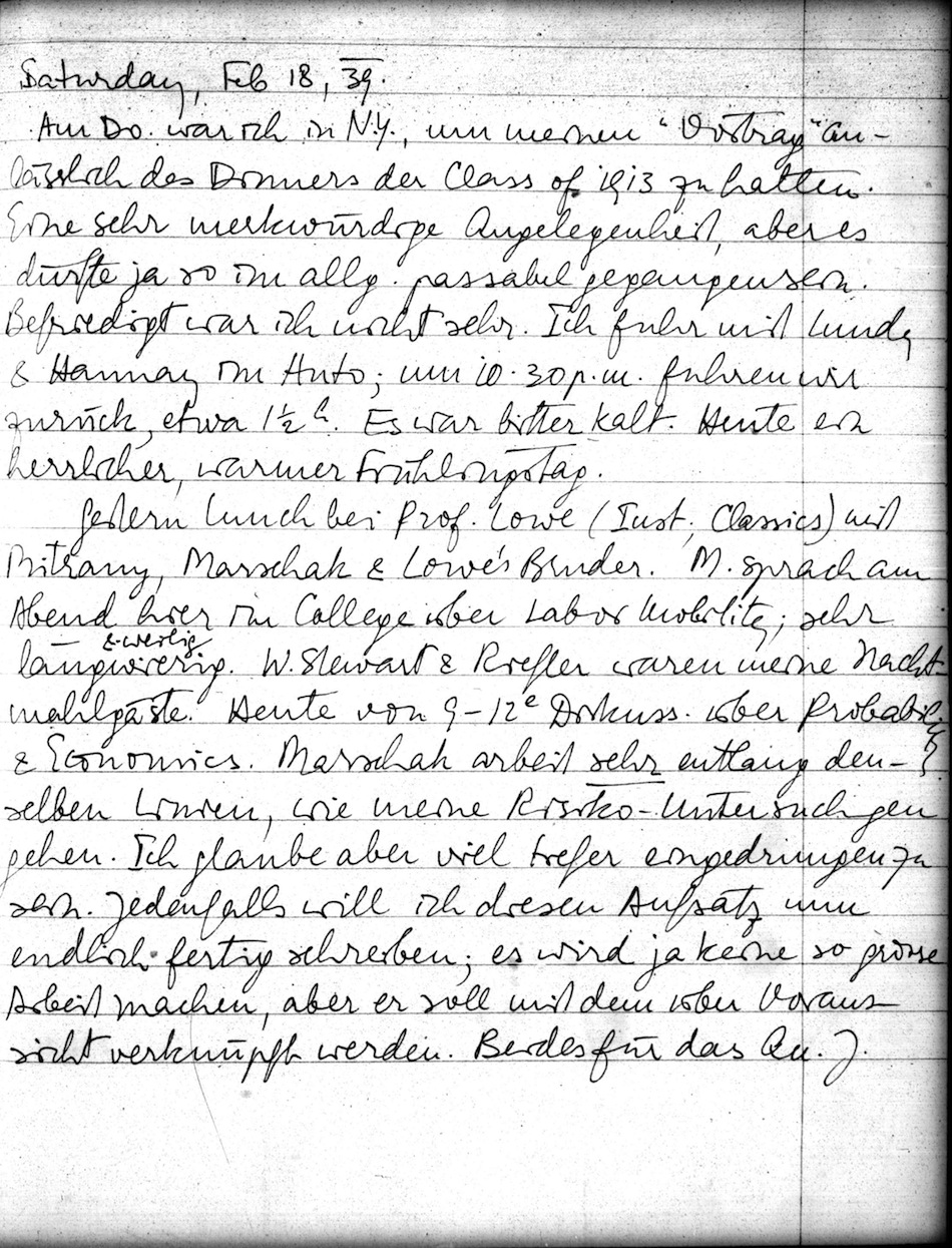 Gestern Lunch bei Prof. Lowe (Inst; Classics) mit Mitrany, Marschak & Lowes Bruder. M. sprach am Abend hier im College über Labor Mobility; sehr langwierig & -weilig. W. Stewart & Riefler waren meine Nachtmahlgäste. Heute von 9-12h Diskuss. über Probability & Economics. Marschak arbeitet sehr entlang denselben Linien, wie meine Risiko-Untersuchungen gehen. Ich glaube aber viel tiefer eingedrungen zu sein. Jedenfalls will ich diesen Aufsatz nun endlich fertig schreiben; es wird ja keine so grosse Arbeit machen, aber er soll mit dem über Voraussicht verknüpft werden. Beides für das Qu. J.