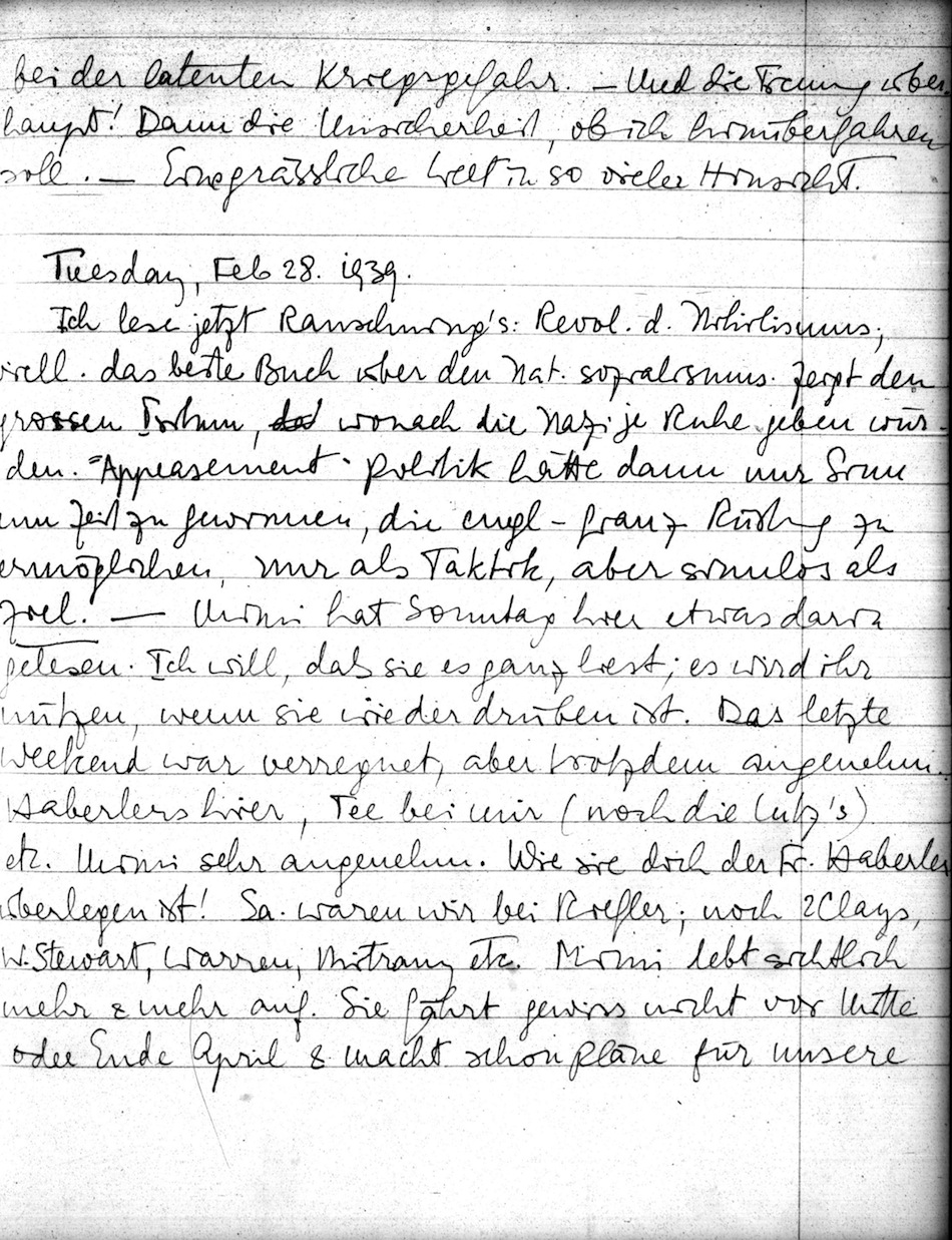 Ich mag gar nicht daran denken, daß Mimi schon Anf. April fahren soll. Es ist so gefährlich bei der latenten Kriegsgefahr. Und die Trennung überhaupt! Dann die Unsicherheit, ob ich hinüberfahren soll. Eine grässliche Welt in so vieler Hinsicht.