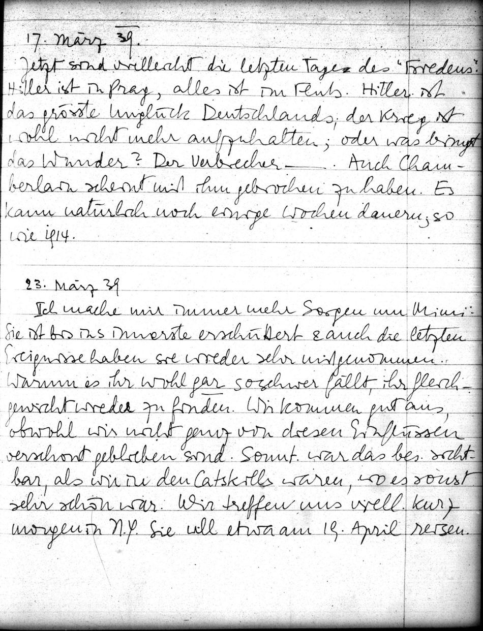 Jetzt sind vielleicht die letzten Tage des Friedens. Hitler ist in Prag, alles ist im Fluß. Hitler ist das grösste Unglück Deutschland; der Krieg ist wohl nicht mehr aufzuhalten; oder was bringt das Wunder? Der Verbrecher . Auch Chamberlain scheint mit ihm gebrochen zu haben. Es kann natürlich noch einige Wochen dauern; so wie 1914.