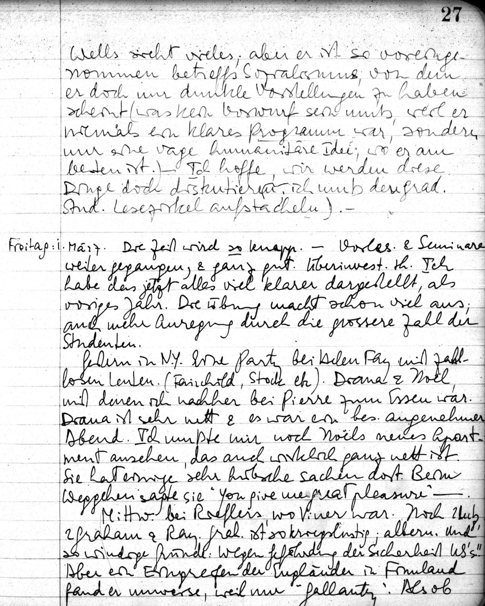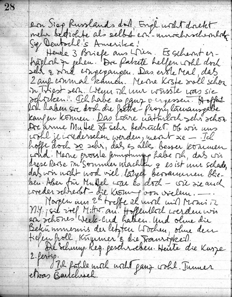 Heute 3 Briefe aus Wien. Es scheint erträglich zu gehen. Die Pakete helfen wohl doch sehr & sind eingegangen. Das erste Mal, daß 2 auf einmal kamen. Meine Kiste soll schon in Triest sein. Wenn ich nur wüsste was sie schicken!! Ich habe es ganz vergessen. Hoffentlich haben sie doch die Goethe-Propyläenausgabe kaufen können. Das wäre natürlich sehr schön. Die arme Muttel ist sehr bedrückt. Ob wir uns wohl je wiedersehen werden, meint sie . Ich hoffe doch so sehr, daß es alles besser kommen wird. Meine grösste Genugtuung habe ich, daß wir diese Reise im Sommer machten & es ist nur schade, daß wir nicht noch viel länger beisammen blieben. Aber für Muttel war es doch wie sie auch wieder schreibt die Krönung von vielem. .