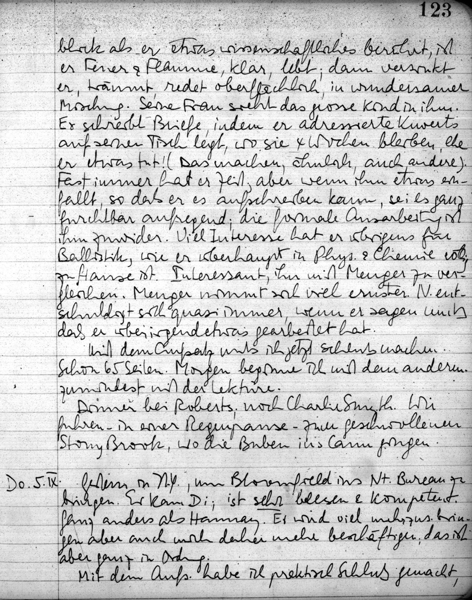 Gestern in N. Y., um Bloomfield ins Nt. Bureau zu bringen. Er kam Di.; ist sehr belesen & kompetent. Ganz anders als Hannay. Er wird viel mehr zus. bringen, aber auch mich daher mehr beschäftigen; das ist aber ganz in Ordnung.