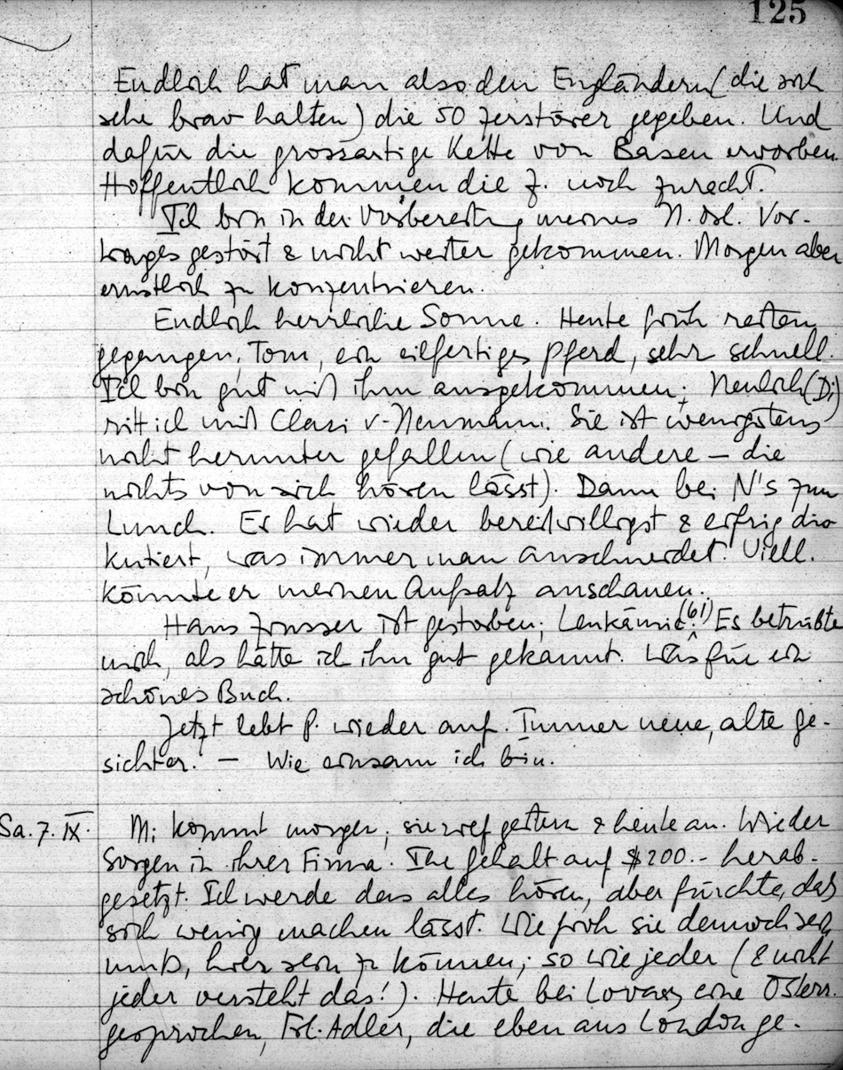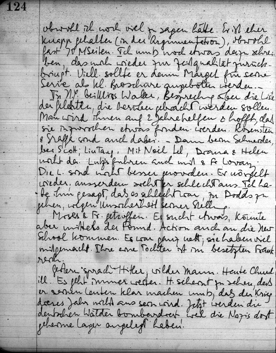 In N. Y. bei Mrs Waller, Besprechung über die Liste der Gelehrten, die herüber gebracht werden sollen. Man wird ihnen auf 2 Jahre helfen & hofft, daß sie inzwischen etwas finden werden. Rosenstein & Sraffa sind auch dabei. Dann beim Schneider, bei Scott, Liu Tang. Mit Noël tel., Diana & Helen nicht da. Lutzs fuhren auch mit & Fr. Lovasy. Die L. sind nicht besser geworden. Er nörgelt wieder; ausserdem sieht er schlecht aus. Ich habe ihm gesagt, daß es schlecht war, zu Dodds zu gehen, wegen Unsicherheit seiner Stellung.