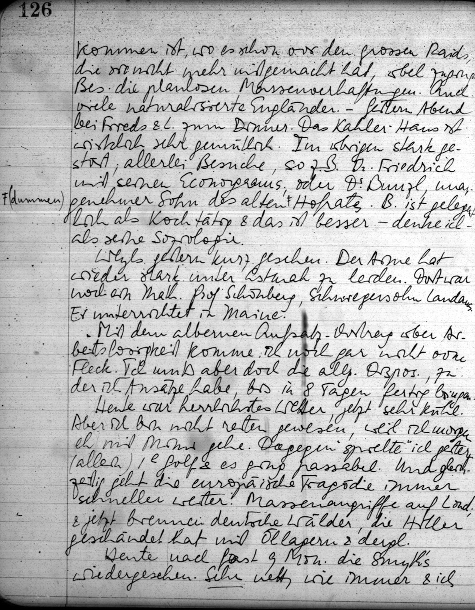 Mi kommt morgen; sie rief gestern & heute an. Wieder Sorgen in ihrer Firma. Ihr Gehalt auf $ 200.- herabgesetzt. Ich werde das alles hören, aber fürchte, daß sich wenig machen lässt. Wie froh sie dennoch sein muß, hier sein zu können; so wie jeder (& nicht jeder versteht das!). Heute bei Lovasy eine Österr. gesprochen, Frl Adler, die eben aus London gekommen ist, wo es schon vor den grossen Raids, die sie nicht mehr mitgemacht hat, übel zuging. Bes. die planlosen Massenverhaftungen. Und viele naturalisierte Engländer. Gestern Abend bei Frieds & L. zum Dinner. Das Kahler-Haus ist wirklich sehr gemütlich. Im übrigen stark gestört; allerlei Besuche, so z. B. Dr Friedrich mit seinen Econograms; oder Dr. Bunzl, unangenehmer (dummer) Sohn des alten Hofrates. B. ist gelegentlich als Koch tätig & das ist besser denke ich als seine Soziologie.