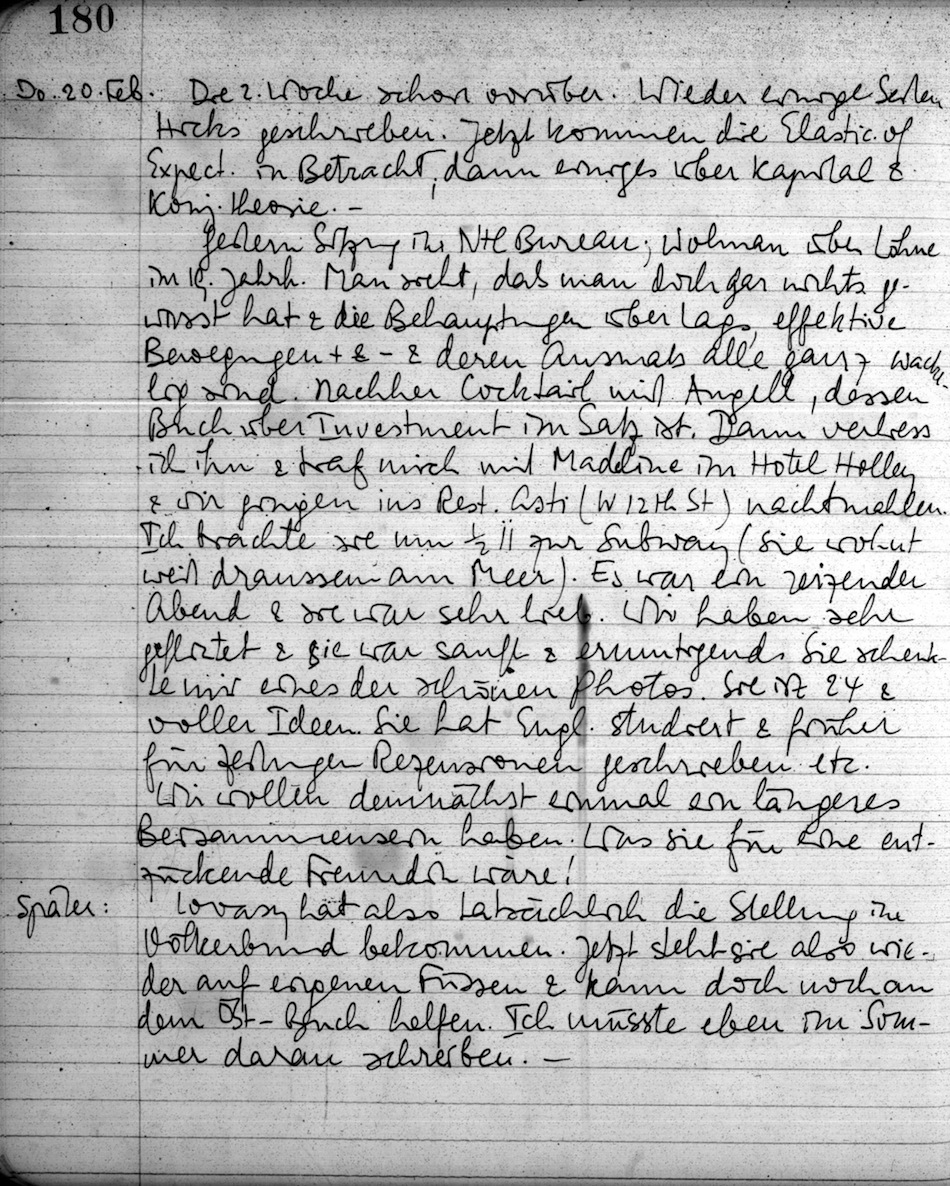 Gestern Sitzung im Ntl. Bureau; Wolman über Löhne im 19. Jahrh. Man sieht, daß man doch gar nichts gewusst hat & die Behauptungen über Lage, effektive Bewegungen & +&- deren Ausmaß alle ganz wackelig sind. Nachher Cocktail mit Angell, dessen Buch über Investment im Satz ist. Dann verliess ich ihn & traf mich mit Madeline im Hotel Holley & wir gingen ins Rest. Asti (W 12th St.) nachtmahlen. Ich brachte sie um ½ 11 zur Subway (sie wohnt weit draussen am Meer). Es war ein reizender Abend & sie war sehr lieb.Wir haben sehr geflirtet & sie war sanft & ermutigend. Sie schenkte mir eines der schönen Photos. Sie ist 24 & voller Ideen. Sie hat Engl. studiert & früher für Zeitungen Rezensionen geschrieben etc. Wir wollen demnächst einmal ein längeres Beisammensein haben. Was sie für eine entzückende Freundin wäre!