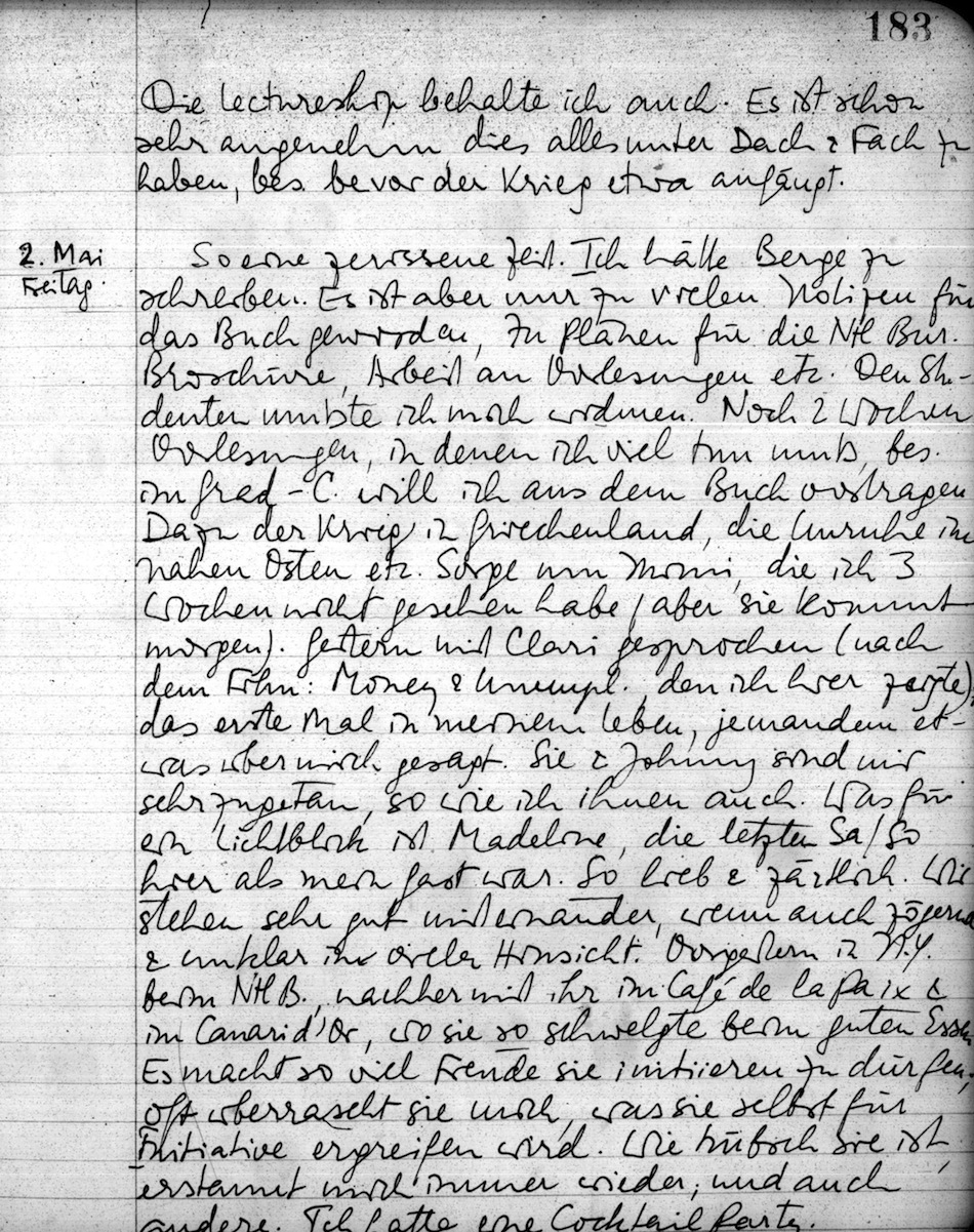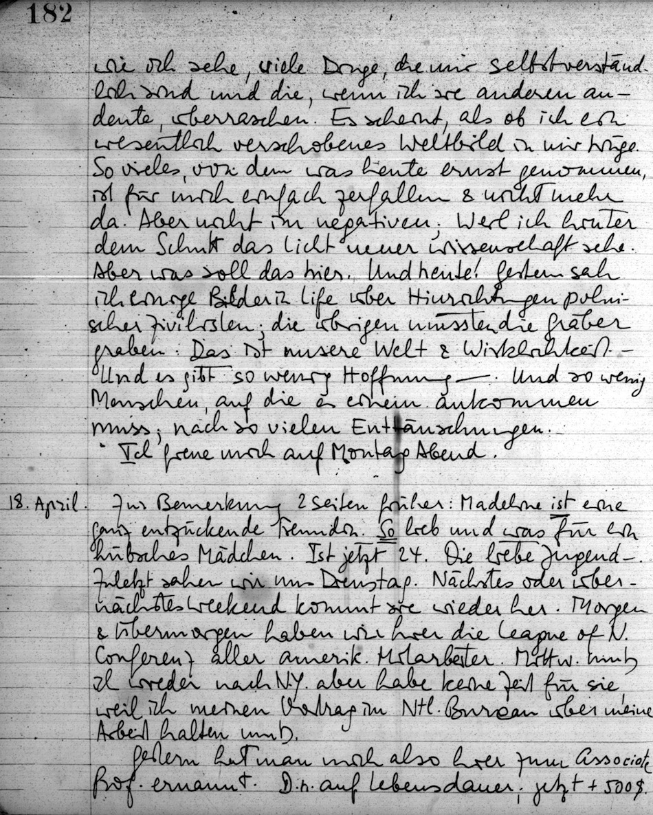 Zur Bemerkung 2 Seiten früher: Madeline ist eine ganz entzückende Freundin. So lieb und was für ein hübsches Mädchen. Ist jetzt 24. Die liebe Jugend . Zuletzt sahen wir uns Dienstag. Nächstes oder übernächstes Weekend kommt sie wieder her. Morgen & übermorgen haben wir hier die League of N. Conferenz aller amerik. Mitarbeiter. Mittw. muß ich wieder nach N.Y., aber habe keine Zeit für sie, weil ich meinen Vortrag im Ntl. Bureau über meine Arbeit halten muß.