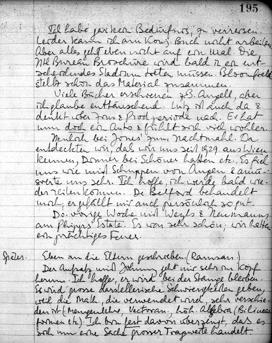Johnny kam Sonnt. Abend um sich mit mir auszusprechen (wegen Clari). Ich habe ihm zugeredet, aber es gibt doch Schwierigkeiten & er leidet. Clari kommt mit seinem Kinde nicht aus. Er ist wohl der ausserordentlichste Mensch den ich kenne. Alle, die es wissen müssen, sagen, daß er einer der grössten, wenn nicht der grösste lebende Math. ist. Gleiche Klasse wie Hilbert Poincaré. Wir stehen uns nun auch persönlich so nahe; bes. in den letzten Monaten ist das geworden.