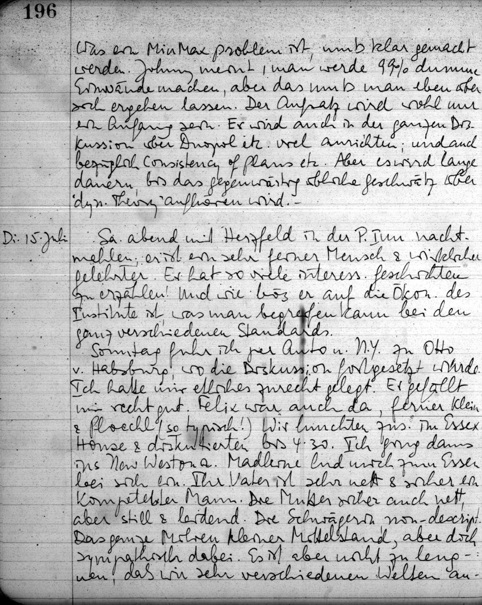 Eben an die Eltern geschrieben (Ramsau). Der Aufsatz mit Johnny geht mir sehr im Kopf herum. Ich hoffe, er wird bei der Stange bleiben. Es wird grosse darstellerische Schwierigkeiten geben, weil die Math., die verwendet wird, sehr verschieden ist (Mengenlehre, Vectoran., höh. Algebra (Bilinearformen etc). Ich bin fest davon überzeugt, daß es sich um eine Sache grosser Tragweite handelt. Was ein MinMax Problem ist, muß klar gemacht werden. Johnny meint, man werde 99% dumme Einwände machen, aber das muß man eben über sich ergehen lassen. Der Aufsatz wird wohl nur ein Anfang sein. Er wird auch in der ganzen Diskussion über Duopol etc. viel anrichten; und auch bezüglich consistency of plans etc. Aber es wird lange dauern, bis das gegenwärtig übliche Geschwätz über "dyn. Theory" aufhören wird.