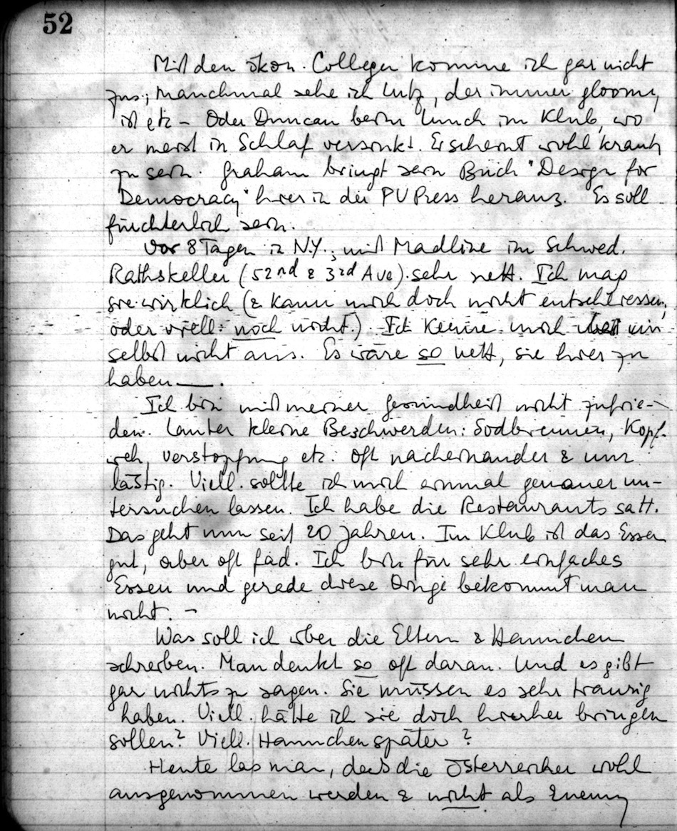 Mit den ökon. Collegen komme ich gar nicht zus.; manchmal sehe ich Lutz, der immer gloomy ist etc. Oder Duncan beim Lunch im Klub, wo er meist in Schlaf versinkt. Er scheint wohl krank zu sein. Graham bringt sein Buch "Design for Democracy" hier in der PU Press heraus. Es soll fürchterlich sein.