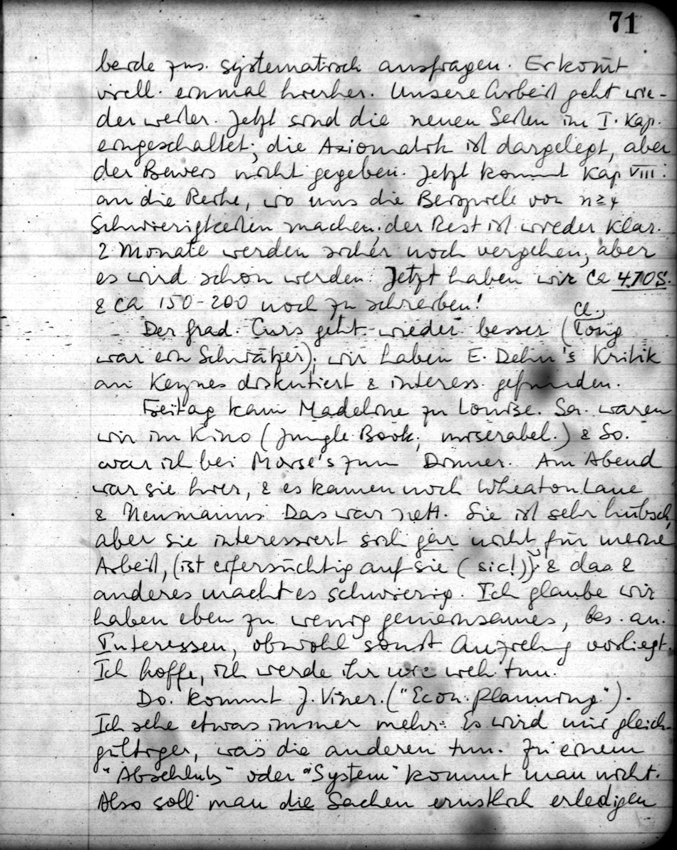 Do. kommt J. Viner ("Econ. planning"). Ich sehe etwas immer mehr: Es wird mir gleichgültiger, was die anderen tun. Zu einem "Abschluß" oder "System" kommt man nicht. Also soll man die Sachen ernstlich erledigen, wo man wirklich etwas machen kann. Das ist ja jetzt mit Johnny der Fall. Der Abgrund, im Wesen unserer Theorie, gegenüber der herrschenden, wird mir nun auch psychisch immer bewusster. Aber es ist im eigentlichen im Sinne einer Erleichterung.