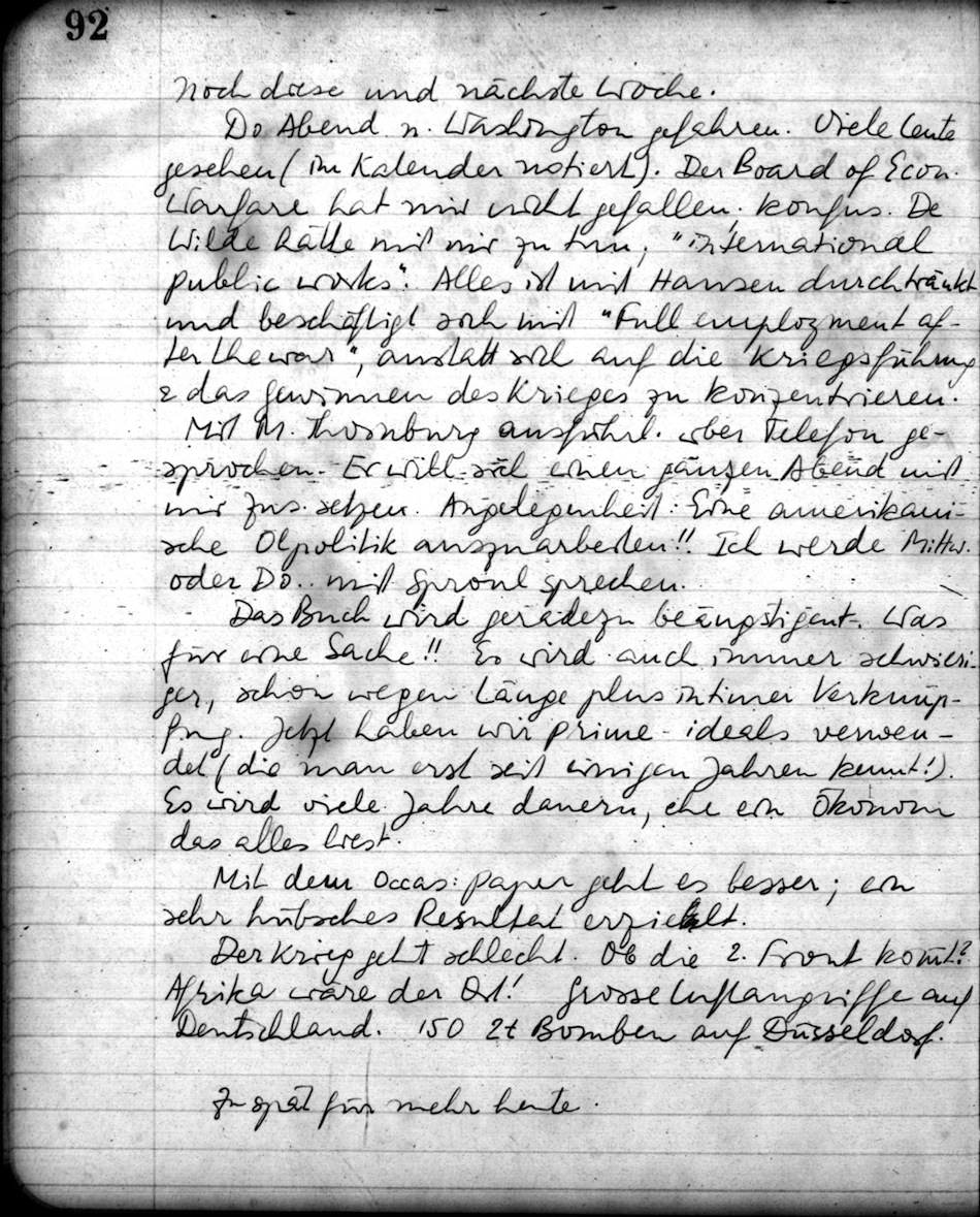 Do. Abend n. Washington gefahren. Viele Leute gesehen (im Kalender notiert). Der Board of Econ. Warfare hat mir nicht gefallen; konfus. De Wilde hätte mit mir zu tun; "international public works". Alles ist mit Hansen durchtränkt und beschäftigt sich mit "Full employment after the war", anstatt sich auf die Kriegsführung & das Gewinnen des Krieges zu konzentrieren.