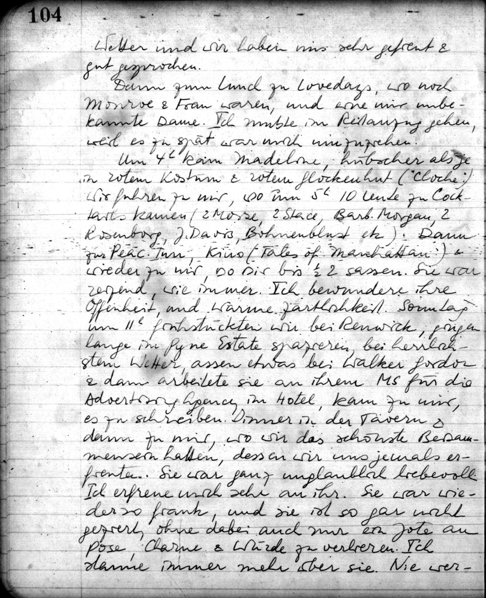 Um 4h kam Madeline, hübscher als je, in rotem Kostüm & rotem Glockenhut ("Cloche"). Wir fuhren zu mir, wo um 5h 10 Leute zu Cocktails kamen (2 Morse, 2 Stace, Barb. Morgan, 2 Rosenberg, J. Davis, Bohnenblust etc.). Dann zur Peac. Inn, Kino ("Tales of Manhattan") & wieder zu mir, wo wir bis ½ 2 sassen. Sie war reizend, wie immer. Ich bewundere ihre Offenheit und warme Zärtlichkeit. Sonntag um 11h frühstückten wir bei Renwick, gingen lange im Pyne Estate spazieren, bei herrlichstem Wetter, assen etwas bei Walker Gordon & dann arbeitete sie an ihrem MS für die Advertising Agency, im Hotel, kam zu mir, es zu schreiben. Dinner in der Tavern & dann zu mir, wo wir das schönste Beisammensein hatten, dessen wir uns jemals erfreuten. Sie war ganz unglaublich liebevoll. Ich erfreue mich sehr an ihr. Sie war wieder so frank, und sie ist so gar nicht geziert, ohne dabei auch nur ein Jota an Pose, Charme & Würde zu verlieren. Ich staune immer mehr über sie. Nie werde ich ihr vergessen, wie nett sie zu mir ist. Was immer werden mag, sie hat mir jetzt schon mehr geschenkt, an wirklicher inniger Herzlichkeit als ich je besessen oder bekommen habe. Ein liebes Mädchen. Und so schön und jung!