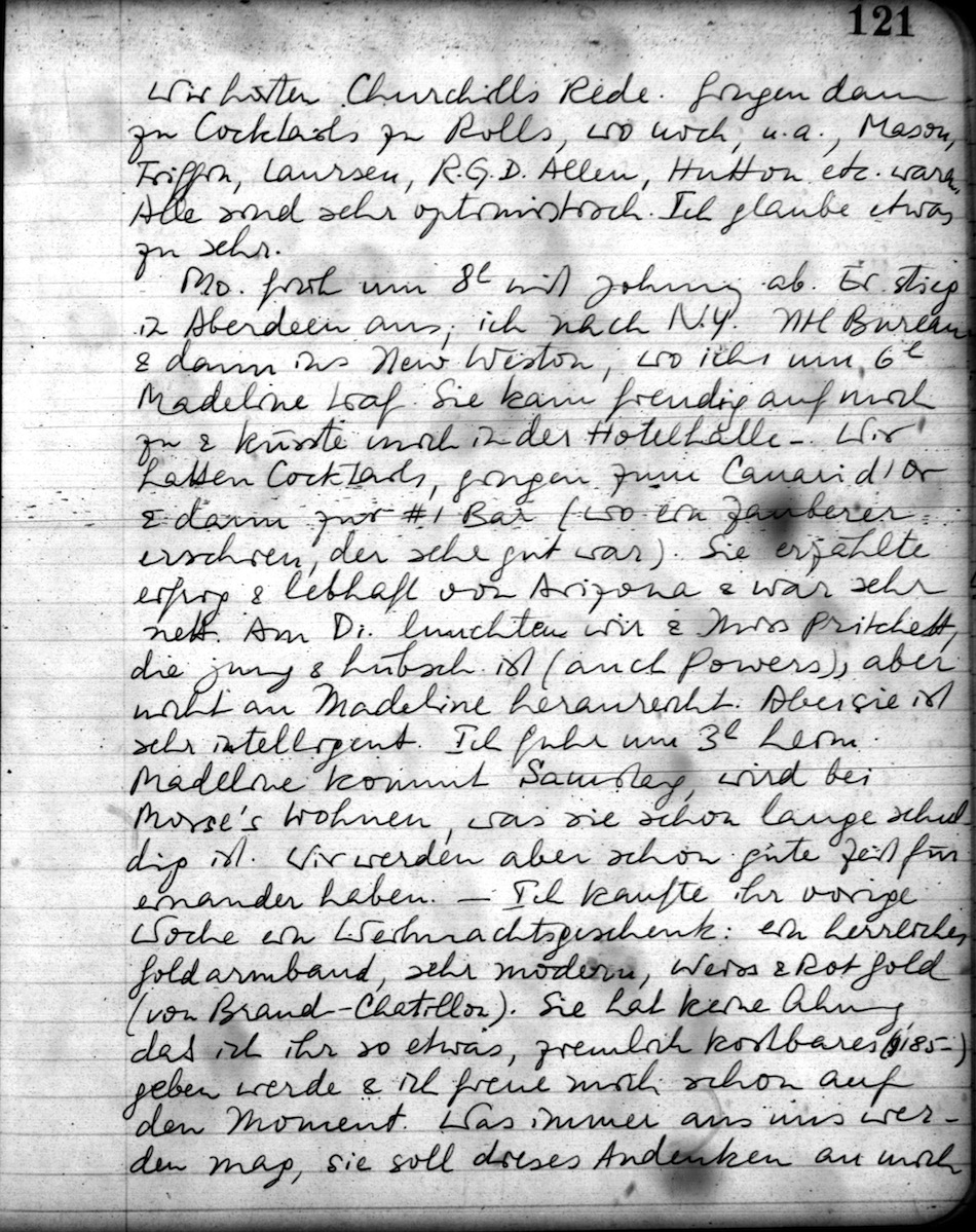 Mo. früh um 8h mit Johnny ab. Er stieg in Aberdeen aus; ich nach N.Y. Ntl. Bureau & dann ins New Weston, wo ich um 6h Madeline traf. Sie kam freudig auf mich zu & küsste mich in der Hotelhalle. Wir hatten Cocktails, gingen zum Canari d'Or & dann zur # 1 Bar (wo ein Zauberer erschien, der sehr gut war). Sie erzählte eifrig & lebhaft von Arizona & war sehr nett. Am Di. lunchten wir & Miss Pritchett, die jung & hübsch ist (auch Powers), aber nicht an Madeline heranreicht. Aber sie ist sehr intelligent. Ich fuhr um 3h heim. Madeline kommt Samstag, wird bei Morse's wohnen, was sie schon lange schuldig ist. Wir werden aber schon gute Zeit für einander haben. Ich kaufte ihr vorige Woche ein Weihnachtsgeschenk: ein herrliches Goldarmband, sehr modern, Weiss & Rot Gold (von Brand-Chatillon). Sie hat keine Ahnung, daß ich ihr so etwas ziemlich kostbares (185,-) geben werde & ich freue mich schon auf den Moment. Was immer aus uns werden mag, sie soll dieses Andenken an mich haben, denn ich bin ihr so dankbar für so viele schöne Stunden & ihre liebevolle Zuneigung .